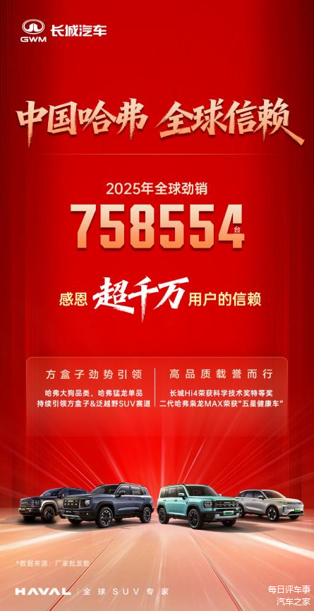 2025年,哈弗品牌在竞争激烈的汽车市场中,交出了一份扎实的成绩单:2025年全球劲销758554辆,同比增长7.41%。更值得关注的是,其全球累计用户在2025年正式突破1000万大关。