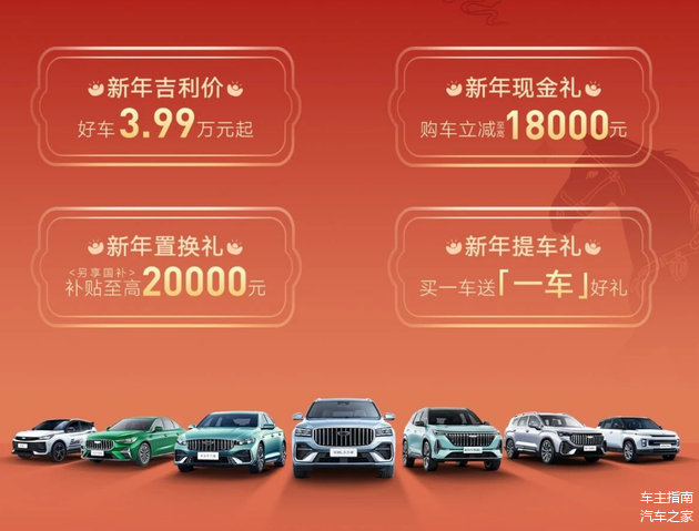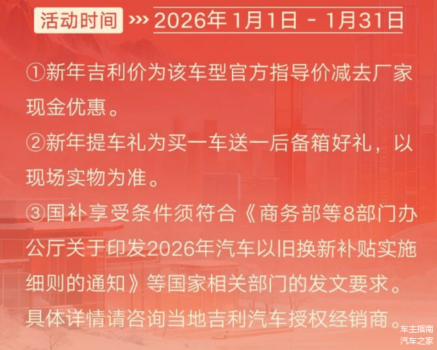 根据官方的宣传,此次活动可享受至高20000元厂家置换补贴,其中享受现金补贴的车型优惠至高达到了1.8万(星越L、缤瑞COOL),用户提车还可享受“买一车送【一车】好礼”活动,即为“送一后备厢旺旺大礼包”,优惠活动时间为2026年1月1日至2026年1月31日。