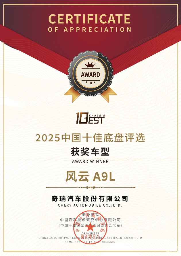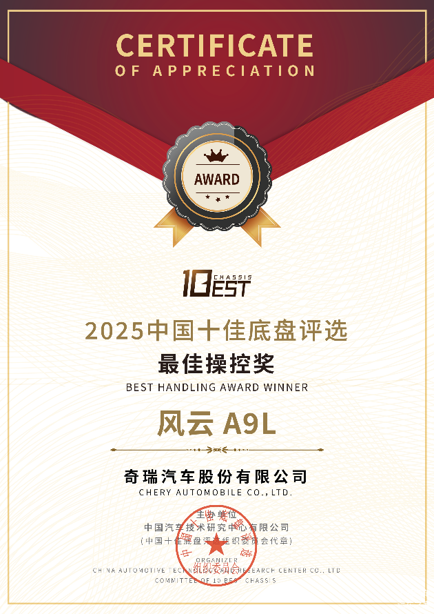 除了核心的动力能效,风云A9L在操控性能上的表现也获得权威盖章。2025年9月,它从百余款车型中脱颖而出,一举拿下“2025中国十佳底盘”综合奖与“最佳操控奖”单项奖,成为同级别唯一获此双奖的轿车。该评选由中汽中心联合全球权威机构打造,其在麋鹿测试、连续弯道等项目的优异表现,能让用户在紧急避障时更从容,过弯时车身更稳定,城市通勤或长途自驾都能兼顾操控乐趣与乘坐舒适。