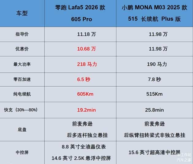 而小鹏MONA M03 2025款 515 长续航 Plus版的指导价为11.98万,目前并没有优惠可言,这个版本的电池容量为51.8KWh,纯电续航里程为515Km,快充时间为25.8分钟,不得不说零跑Lafa5这款车在价格占优的局面下,续航、补能效率还是有不错的优势。