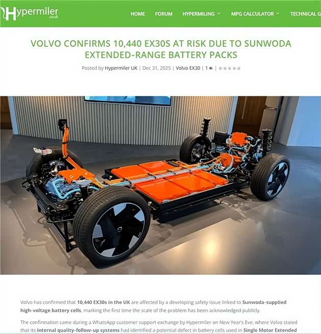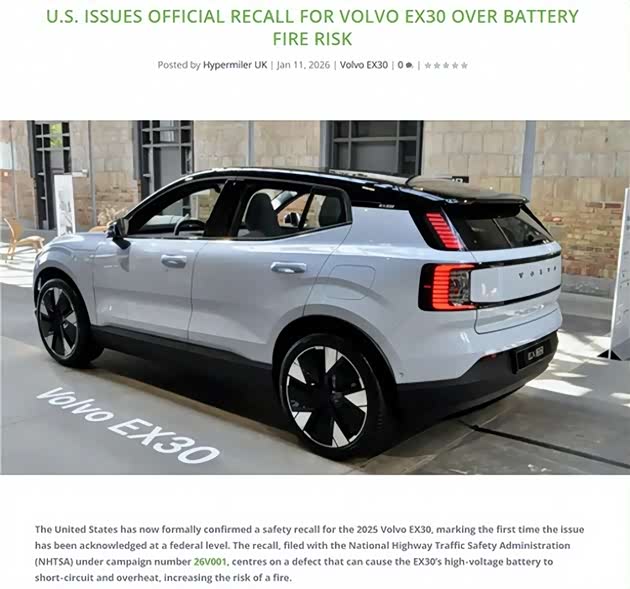 2026年1月初,沃尔沃突然宣布在全球多地召回EX30车型,包括美国、加拿大、英国、南非等地,涉及车辆超3万辆。召回原因很吓人:电池存在过热风险,可能导致起火!沃尔沃紧急通知车主:“别把电池充满,70%就行!”这一操作直接让车主们炸了锅——续航缩水30%,开电动车变成了“短途代步”。