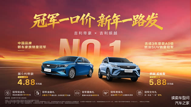 2026吉利中国年,好事连连驫新年!吉利汽车再爆王炸优惠,价格直降到底,错过再等一年!1月15日至2月28日,吉利中国星“双冠车型”吉利帝豪与吉利缤越联手推出“冠军一口价”新年限时活动,第4代帝豪4.88万元起,缤越超能版5.88万元起,以触手可及的价格助力更多用户新年开冠军好车,马上得“冠军”好运!