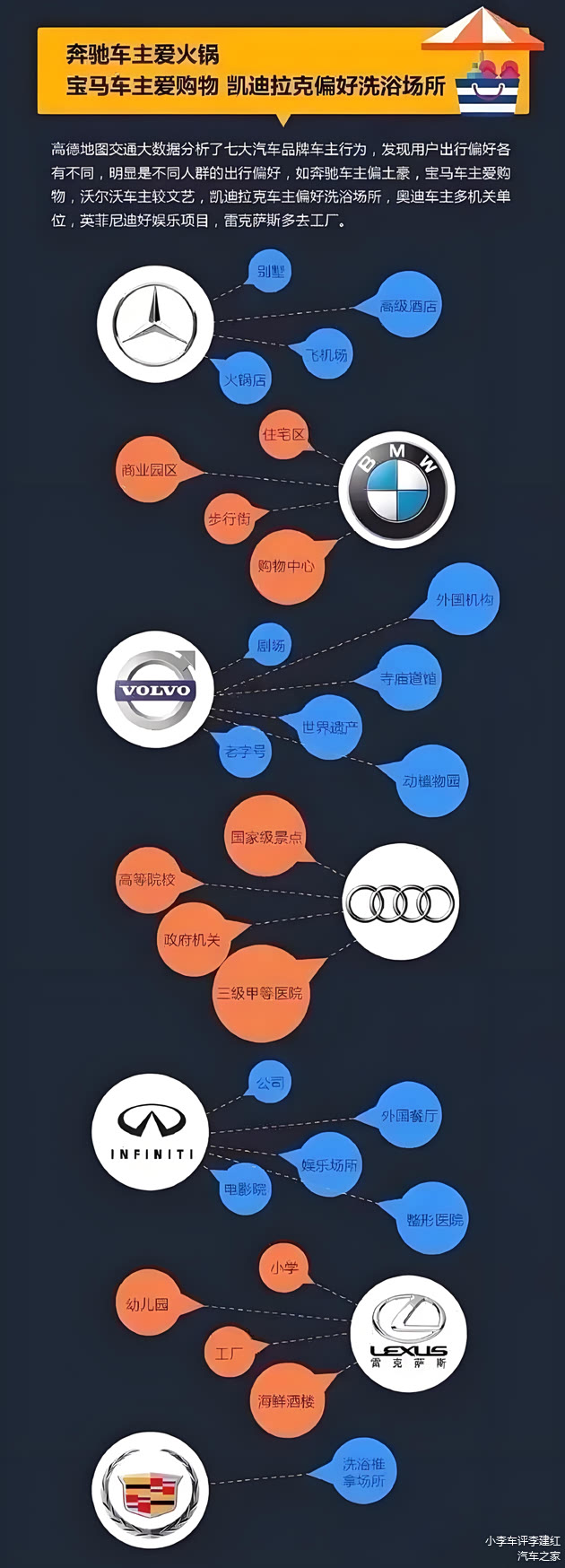 事实上,凯迪拉克之所以变成“浴皇大帝”,还是多年前高德地图推出的一份“七大品牌车主行为”,其中就明确提到了奔驰车主偏土豪、宝马车主爱购物、沃尔沃车主较为文艺、凯迪拉克车主偏好洗浴场所……而且那么一份长长的车主出行目标,其他豪华品牌车主都至少有四个常去的地方,到了凯迪拉克车主这里,只有“洗浴推拿场所”一个地方,这就彻底坐实了凯迪拉克车主爱去洗浴中心的车主标签,一传就是好多年。