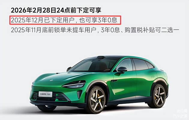新势力这边如小米汽车,则是给到了“0息”金融政策,例如在2月底前下定YU7车型,选择3年0息可节省约1.1万元的利息。同时还有一系列选装权益赠送,包括碳纤维饰板等高级配置。