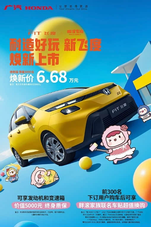 全新本田飞度正式上市,推出单一配置的焕新版车型,“一口价6.68万元+全国限量3000台”,前300名下订用户提供发动机和变速箱终身质保。