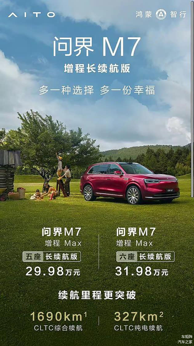 问界M7增程长续航共两款车型,分别为2026款增程Max长续航版5座及6座,售价为29.98万元和31.98万元,在这两款车型发布前,问界M7增程类车型纯电续航里程最长为315Km,此次长续航版能使纯电里程达到327Km,综合续航里程也达到了“惊人”的1690Km,创造了增程式混动领域新的纪录。