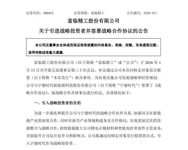 几乎在同一时间,宁德时代的另一项战略投资浮出水面。1月13日晚间,富临精工公告称,拟通过向特定对象发行股票的方式,引入宁德时代作为战略投资者。宁德时代将以13.62元/股的价格认购2.33亿股,投资31.75亿元,交易完成后持股比例将超过5%。