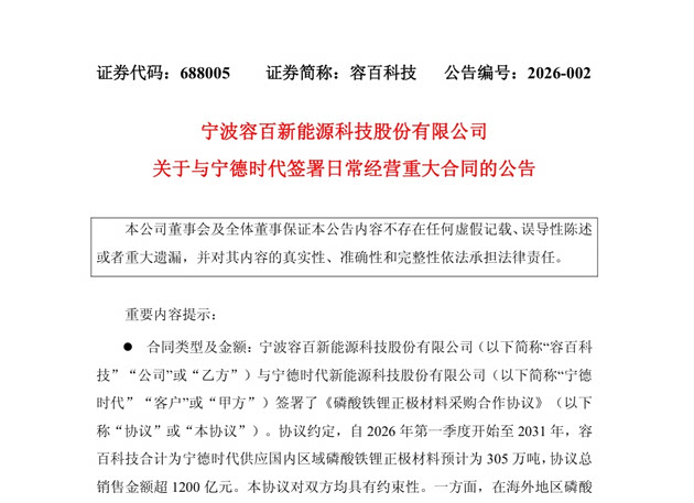 1月13日,容百科技发布公告,宣布与宁德时代签署了《磷酸铁锂正极材料采购合作协议》。这份协议被业内称为“史上最大规模的磷酸铁锂采购协议”。该协议约定,自2026年第一季度开始至2031年,容百科技合计为宁德时代供应国内区域磷酸铁锂正极材料预计为305万吨,协议总销售金额超1200亿元。此次磷酸铁锂材料采购协议具有明确的约束性,也是双方继2025年11月份钠离子电池正极材料战略合作后的又一重要布局。