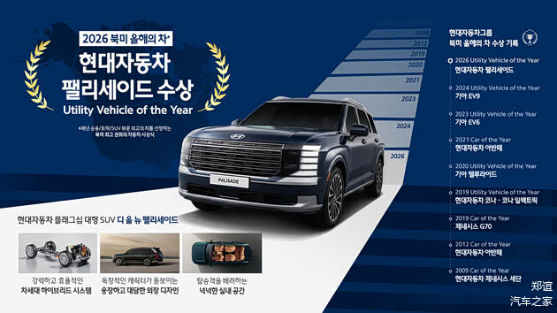 现代汽车,旗下车型 帕里斯帝在美国底特律亨廷顿广场举办的2026 北美年度风云车(NACTOY) 颁奖典礼上,成功斩获多功能车(Utility)类别年度风云车称号。