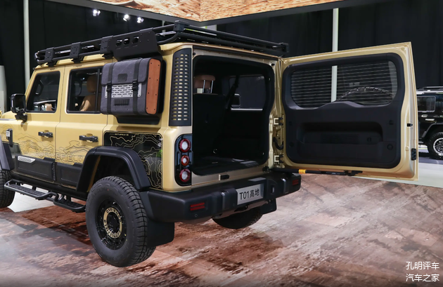 看车身侧面确实有不少的专业越野套件,包括上下车踏板以及车顶行李架都是高强度管件,原厂状态下已经是重型防脱圈轮毂搭配了at越野轮胎。再加上尾部专业改造的高强度备胎架,能够感觉到这款车就是为那些专业级别的越野老炮而准备,看起来并不是花架子,而是针对性和专业性很强的。