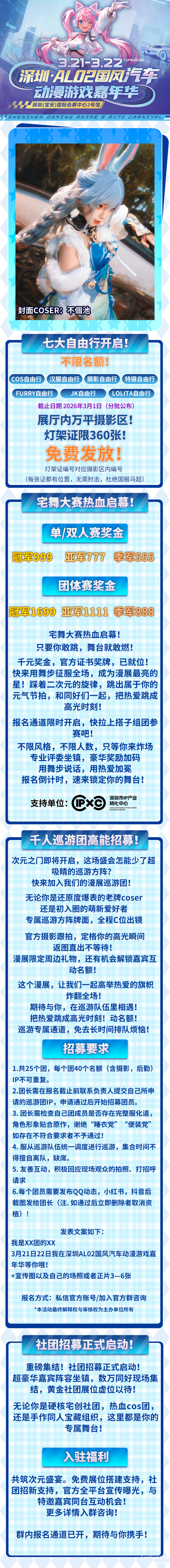 华南地区首个国风+汽车+动漫游戏的跨界嘉年华——深圳AL02国风汽车动漫游戏嘉年华,将于2026年3月21日-22日登陆深圳(宝安)国际会展中心2号馆,本次嘉年华将和“2026 深圳国际性能及定制改装汽车展览会”同期联动,开启双倍惊喜。