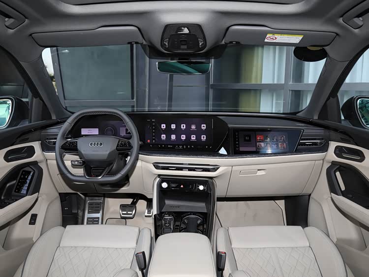 车厢采用和全新A5L一样的设计风格,环抱式座舱布局,提供黑色、黑色/米色、黑色/棕色和黑色/赤陶红色四种配色选择。采用全新样式的平底方向盘,搭载11.9英寸的仪表+14.5英寸中控屏组成双连屏,部分车型还拥有13.1英寸HUD,副驾10.9英寸娱乐屏。