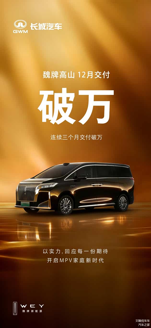 2025 年收官之战落下帷幕,魏牌高山以无可撼动的实力惊艳整个 MPV 市场,成功蝉联 12 月 MPV 单月销量冠军,更强势斩获 2025 年 7-12 月半年销量总冠军,“双冠王” 的荣耀加身,让其稳稳占据 MPV 市场王者宝座。这一耀眼成绩不仅延续了它 “连续三月销量破万” 的强劲市场表现,更标志着魏牌高山已彻底摆脱 “黑马” 标签,成长为引领 MPV 市场结构性变革的核心力量,为中国自主品牌在高端 MPV 领域写下了浓墨重彩的一笔。