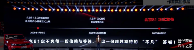 1月15日,北京越野发布北京81 2.0共创版车型,并公布量产版将于2026北京车展亮相并开启预售,计划在8月1日上市。官方透露,新车将提供“常规版”和“专业版”两种配置选择,以满足不同用户的越野需求。这一时间表意味着,从车展亮相到量产上市,消费者将有大约四个月的观察和体验期,有助于在购车决策中进行比较。