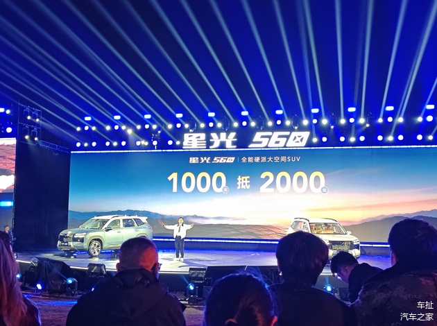 星光560外观采用硬派SUV造型,风格方正硬朗,燃油和插混版前脸采用开放式蜂窝状前格栅,前包围处加入枪灰色梯形饰件。纯电版采用封闭式前格栅,点缀大量熏黑装饰,提升视觉张力。新车采用悬浮式车顶设计,配备亮黑色车顶行李架。