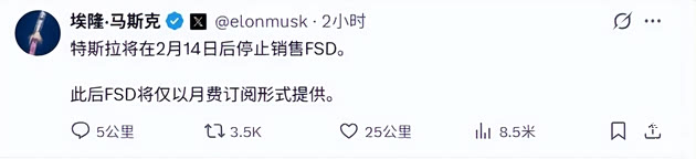 1月14日,马斯克的一则社交平台声明:自2月14日起,特斯拉FSD(完全自动驾驶能力)将在全球范围内停止销售一次性买断版本,未来仅提供月度订阅服务。这一调整,不仅标志着特斯拉从“卖硬件+卖软件”向“卖服务”的深度转型,更预示着智能驾驶行业“软件即服务”(SaaS)的商业模式正式成为主流。