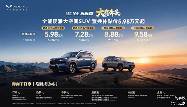 1月15日, 星光560正式上市。作为一台一车三动力的车型,星光560定位是一台硬派SUV,一共四款车型,其中两款1.5T燃油版车型,一款插混车型以及一款纯电版车型,指导价6.28万到9.88万元,置换补贴后售价5.98万到9.58万。