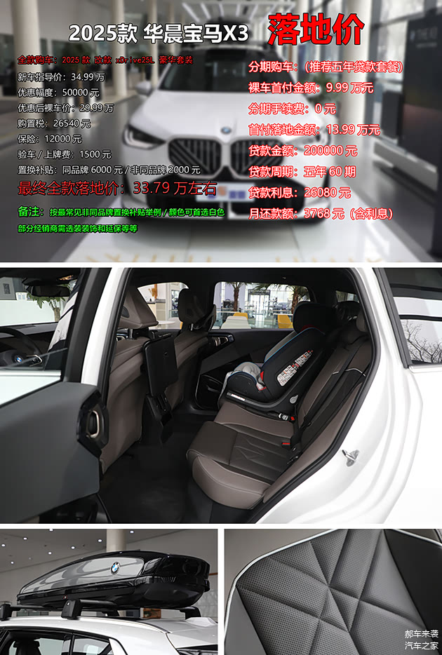 既然选好了车型,那郝哥就来为您算算落地价吧,推荐配置2025款xDrive25L豪华套装官方指导价34.99万元,优惠5万元后裸车价为29.99万元,购置税大概26540元,保险12000元上下,当然还得再算上1500元验车上牌费。值得一提的是,新车还支持同品牌6000元或非同品牌2000元的置换补贴,假如按照最常见非同品牌置换举例,那么最终全款落地价预计为33.79万元。