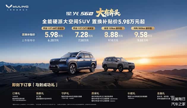 【2026年1月15日】今日,「全能硬派大空间SUV」星光560正式上市。新车共推出四款车型配置:燃油1.5T 6MT舒适型、燃油1.5T CVT精英型、插混125km豪华型、纯电500km豪华型,置换补贴价为5.98万元-9.58万元,原上市指导价为6.28万元-9.88万元。