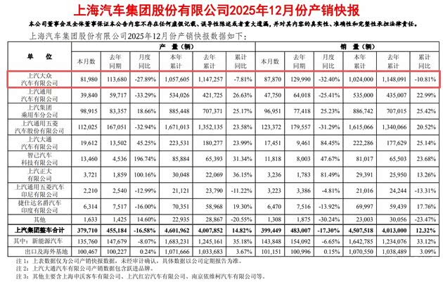 公开数据显示,2025年上汽集团全年销售整车450.7万辆,同比增长12.3%,终端零售销量467万辆,整体表现稳健。但令人意外的是,作为一线合资品牌的上汽大众仍出现不小下滑,面临着一定的市场压力。不过,该业绩在合资企业中还是很不错的。