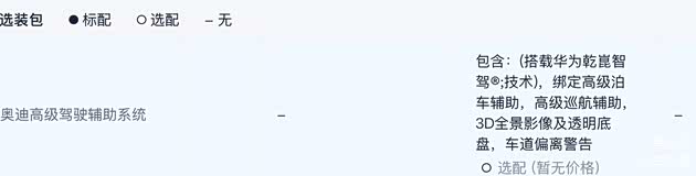 最后令人意外的是,奥迪高级驾驶辅助系统(搭载华为乾崑智驾®技术的高级泊车辅助、高级巡航辅助、3D全景影像及透明底盘、车道偏离警告)看起来全系都可以加装,但在下定的配置单上并未呈现,也没有显示加装价格,相当于目前订购的话是无法选装的。