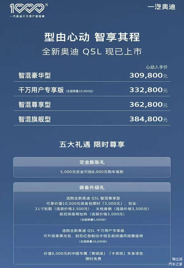 1、 正式价格要低于此前发布的预售价,比如预售价是31.3万元起,正式发售价为30.98万元起,要注意这是官方建议价,相比此前Q5L车系,官方建议价是34.98万元起步,换代新车还是体现出了充分的诚意。