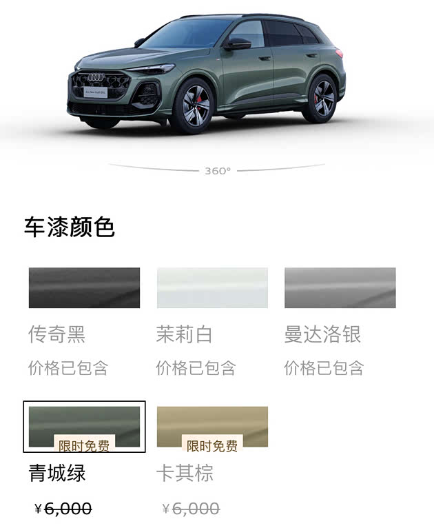 全系青城绿和卡其棕车身颜色免费送,这就相当于全新Q5L的5款车身颜色都是免费的。