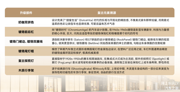 细节之处,尽显摩登巧思。复古探照灯的设计,让人联想到上世纪中期赛车与高端跑车的野性优雅;木质纹理的车顶行李架,则唤醒了经典旅行车所代表的自由、悠闲生活方式。镀铬门裙边与双腰线勾勒出修长侧影,镀铬尾灯框复刻了早期汽车的机械美感。甚至在内饰中,甜品造型的换挡旋钮、游戏手柄风格的功能按键,都于细微处注入趣味与甜心气质。