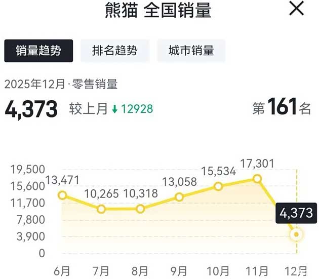 吉利银河熊猫在2025年12月份的销量为4373辆,相比2025年11月份的销量17301辆,环比下滑74.72%。