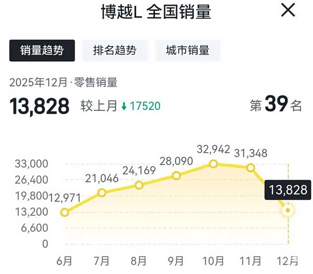 其中吉利博越L在2025年12月份的销量为13828辆,相比2025年11月份的销量31348辆,环比下滑55.88%;