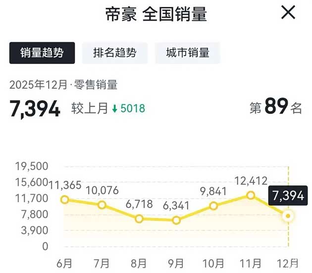 吉利帝豪在2025年12月份的销量为7394辆,相比2025年11月份的销量12412辆,环比下滑40.42%;