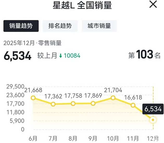 吉利星越L在2025年12月份的销量为6534辆,相比2025年11月份的销量16618辆,环比下滑60.68%;