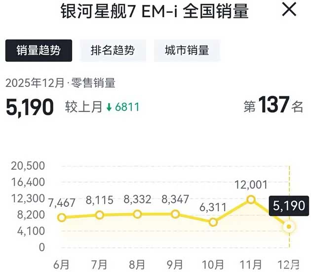 吉利银河星舰7 EM-i在2025年12月份的销量为5190辆,相比2025年11月份的销量12001辆,环比下滑56.75%;