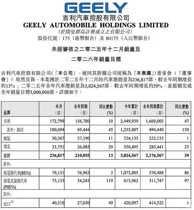日前,吉利汽车发布公告,2025年全年汽车总销量为3,024,567辆,较去年同期增长约39%,超额完成全年销量目标3,000,000辆。