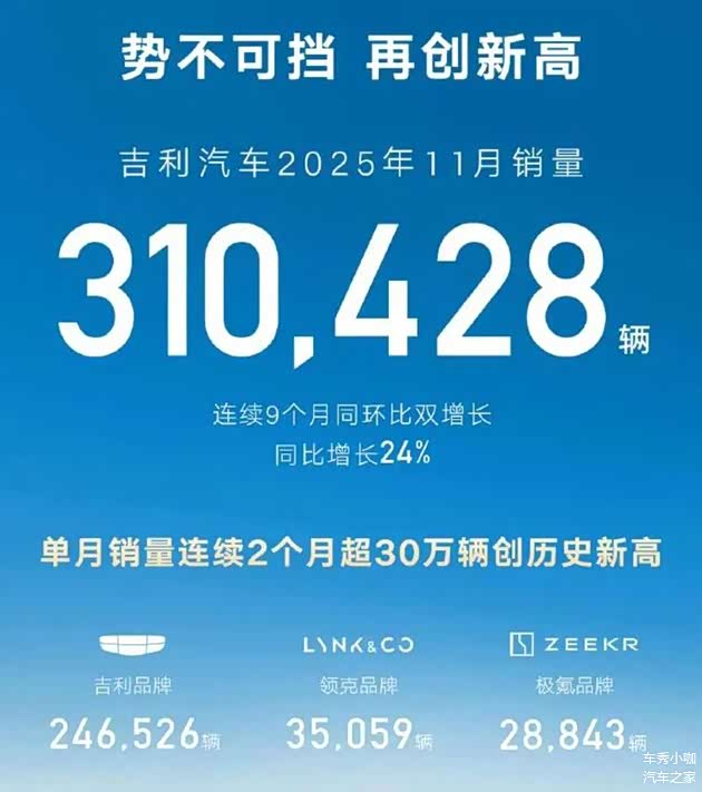 作为对比,吉利汽车在2025年11月份的销量为310,428辆,其中吉利及银河系列销量246,526辆,极氪品牌28843辆,领克品牌35059辆。