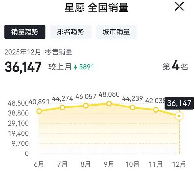 而吉利银河星愿在2025年12月份的销量为36147辆,相比2025年11月份的销量42038辆,环比下滑14.01%;