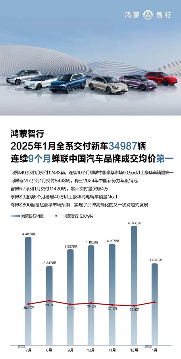 作为鸿蒙智行的核心交付支柱,问界品牌贡献了主要销量增量。25年问界全年累计交付42万辆,领跑高端新能源汽车市场,其中问界新M7表现尤为突出,24年累计销量突破19万辆,连续12个月位居中国新势力车型销量第一,25年全新改款车型上市104天累计交付突破7万辆;问界M9则以上市12个月累计大定超20万辆的成绩,蝉联中国市场50万元级及以上豪华车型销冠。除问界外,鸿蒙智行旗下其他品牌已形成协同增长态势:智界25年12月交付突破1万辆,连续三个月实现交付破万;享界S9T上市25天大定突破2万台,25年9-11月跻身30万以上新能源中大型轿车销量榜首;尊界S800更连续3个月占据70万级豪华轿车榜首,上市202天累计交付突破1万台,创造中国百万级豪华电动车最快交付纪录。