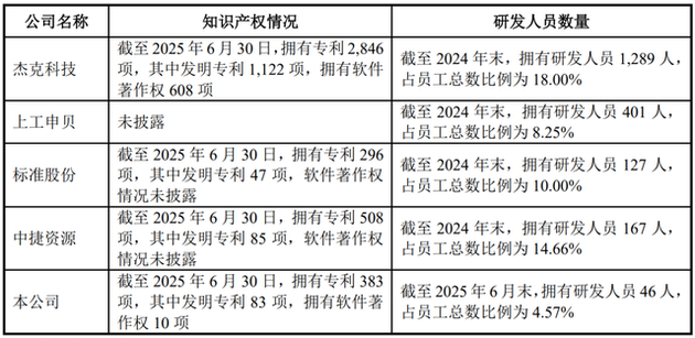 截至2025年上半年末,信胜科技有研发人员46人,仅占员工总数的4.57%,同样低于可比公司8.25%—18%的人员占比。