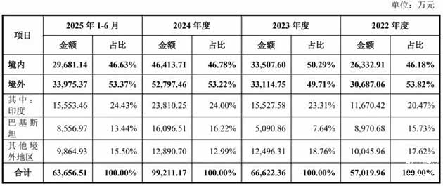 在近年来业绩稳定增长背后,信胜科技超过一半的收入来源于境外,2022年—2024年及2025年上半年,公司境外销售收入分别占主营业务收入的53.82%、49.71%、53.22%和53.37%。