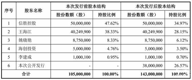截至目前,王海江和姚晓艳夫妇直接持有信胜科技46.67%的股份,并通过信胜控股和海创投资合计控股52.38%,合计控制99.05%的股份对应的表决权,夫妇二人是共同实控人。