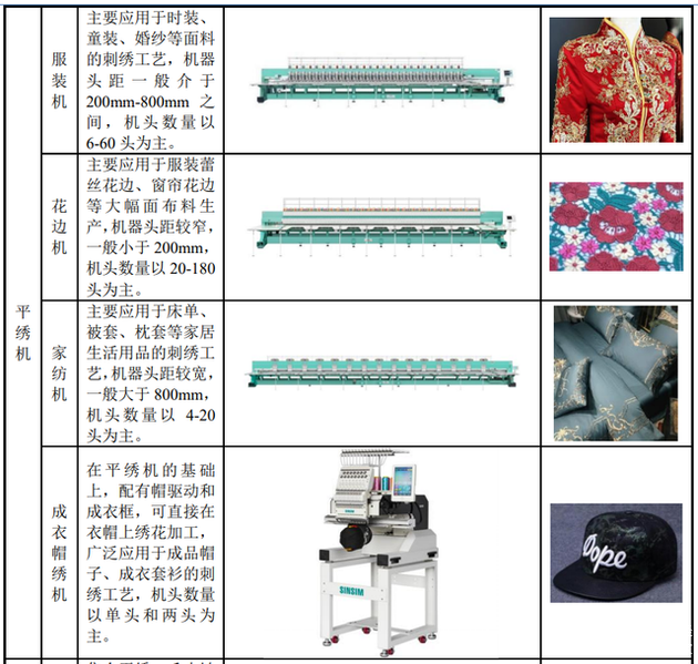 其中,平绣机根据应用场景,可进一步细分为服装机、花边机、家纺机、成衣帽绣机等,可满足生产加工服装、窗帘、床单、鞋帽、玩具时的各类刺绣需求。而特种机根据实现功能不同,可分为混合机、烫片机、毛巾机等,可实现平绣、盘带绣、绳绣等混合工艺,以及烫片、毛巾绣等特殊工艺。