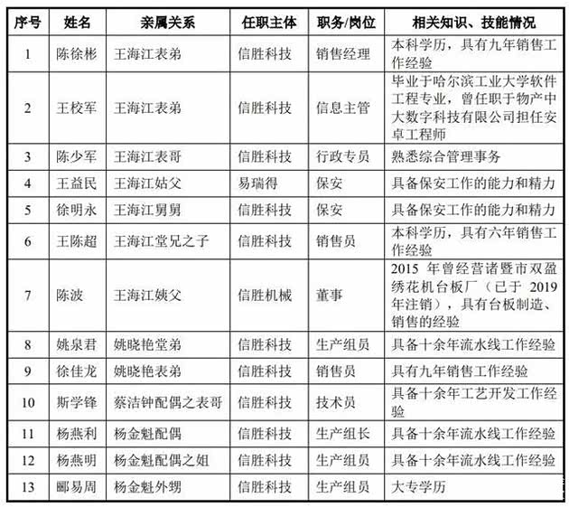 比如王海江的两个表弟和一个表哥分别在信胜科技任销售经理、信息主管和行政专员,姚晓艳的堂弟和表弟分别在信胜科技任生产组员和销售员。此外,信胜科技董事蔡洁钟配偶的表哥在信胜科技任技术员,公司工艺部经理兼生产部经理杨金魁的外甥、配偶以及配偶的姐姐,也分别在信胜科技任生产组员和生产组长。