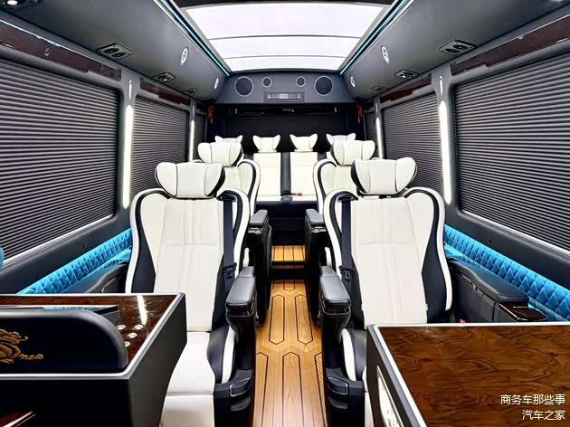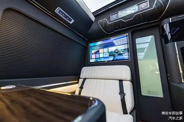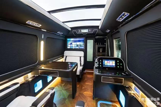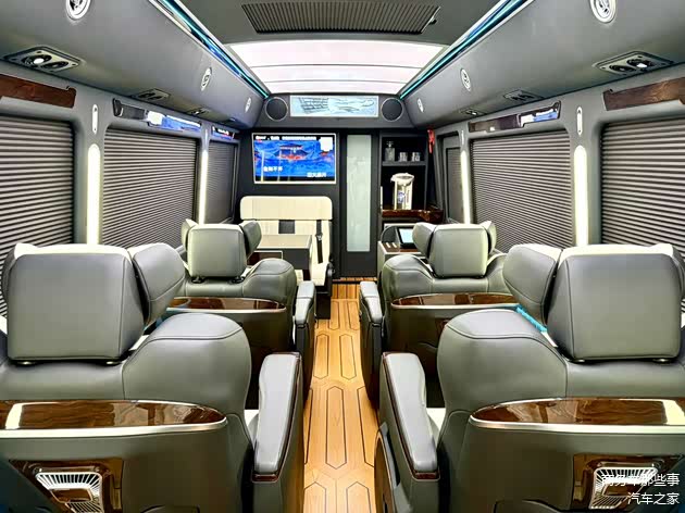 改装版考斯特以全隔断设计划分驾驶舱与乘客区,隔断采用隔音材质打造,搭配电动升降32寸三星高清屏或雾化隐私玻璃,3秒即可在透明与雾化状态间切换——既保障商务会议的私密性,又不影响车内采光与驾驶员沟通。隔断侧面暗藏玄机:嵌入式酒柜可容纳4瓶红酒,隐藏式功夫茶台支持3分钟快速泡茶,搭配制冷杯架与220V电源接口,让商务接待的礼仪感在细节中自然流露。