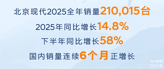 在2025年中国汽车市场深度转型、合资阵营普遍承压的背景下,北京现代交出了一份令人瞩目的年度成绩单:全年销量达成21万台,同比增长14.8%。其中国内市场实现连续6个月的正增长。