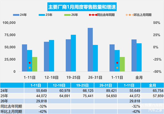 乘联会最新数据一出来,车市直接给 2026 年开了个 “冷场局”:1 月前 11 天乘用车零售暴跌 32%,新能源车更惨,销量拦腰砍半还多,环比狂跌 67%,渗透率直接掉到 35.5%。从 2024 年到 2026 年,开年日均销量从 5.56 万辆跌到 3 万辆,三年连降,车市的 “新年开门红” 彻底变 “开门凉”。