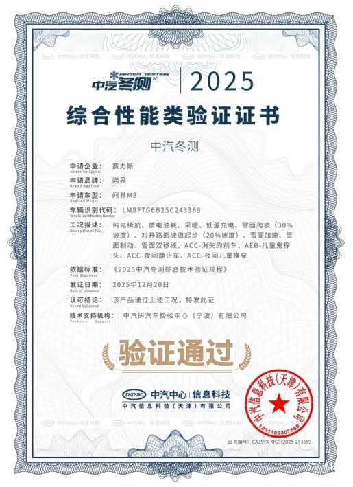 凭借领先产品力,问界M8不仅赢得了市场的广泛认可,累计交付突破15万辆,稳居40万级销量标杆,更在专业领域获得了权威背书:近日,其在2025中汽冬测一举获得“综合性能类验证”“智能底盘安全技术验证”双证书,印证了其在低温环境下的卓越产品力。
