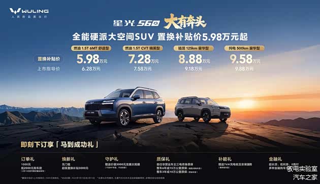 【2026年1月15日】今日,「全能硬派大空间SUV」星光560正式上市。新车共推出四款车型配置:燃油1.5T 6MT舒适型、燃油1.5T CVT精英型、插混125km豪华型、纯电500km豪华型,置换补贴价为5.98万元-9.58万元,原上市指导价为6.28万元-9.88万元。
