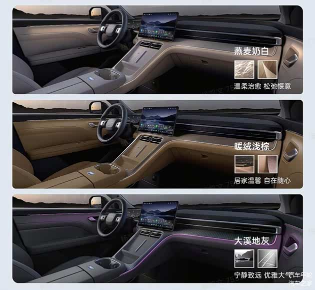 内饰方面,新车采用了家族式设计风格,并且配备了液晶仪表以及悬浮式中控屏。同时,新车提供燕麦奶白、暖绒浅棕、大溪地灰3种内饰颜色。