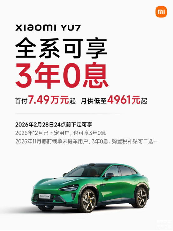 同样,小米在1月1日就率先公布了小米YU7的3年0息金融方案,2月28日24点前下订就能享受,首付7.49万起,月供低至4961元起,这个3年0息不仅1月1日到2月28日下订的用户可以享受,而且12月下订的用户也可以享受,11月底之前锁单还没提车的用户也可以购置税补贴和3年0息二选一,之前下单的也不用担心被背刺,这波照顾还是挺到位的。