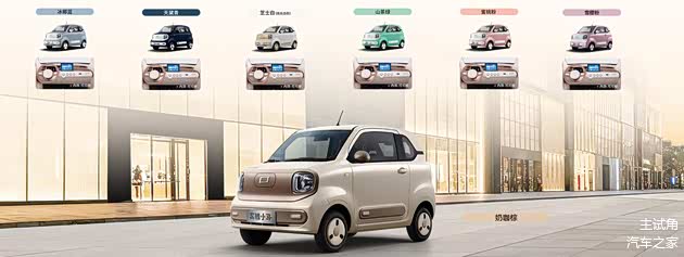 新车一共有7种外观车色可选,分别为冰椰蓝、天黛青、芝士白、山茶绿、蜜桃粉、雪樱粉与奶咖棕,内饰只有一种可可棕色。